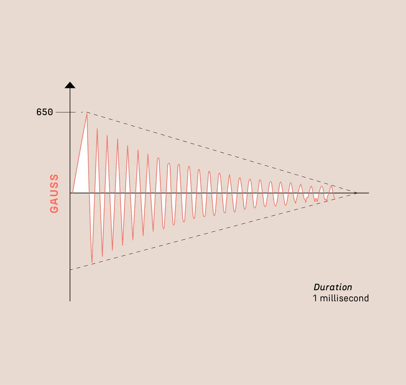 Healing happens when cells are inside the magnetic field (shown in white in this diagram). The longer the pulse train of the wave, the more exposure the cells have to the therapeutic benefits.